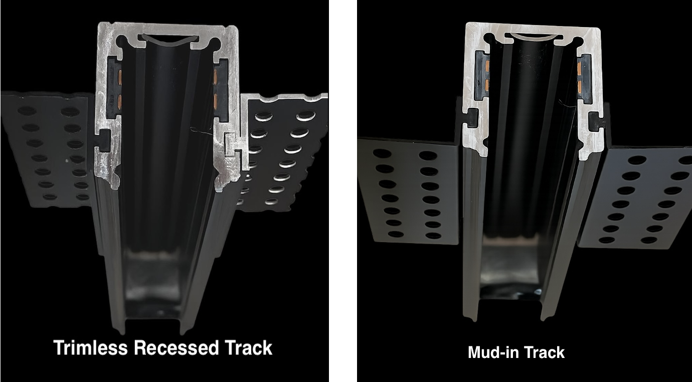 The magnetic track can be configured for either Trimless recessed or mud-in (trimless) installation by reversing the trim (ears) downward during installation.